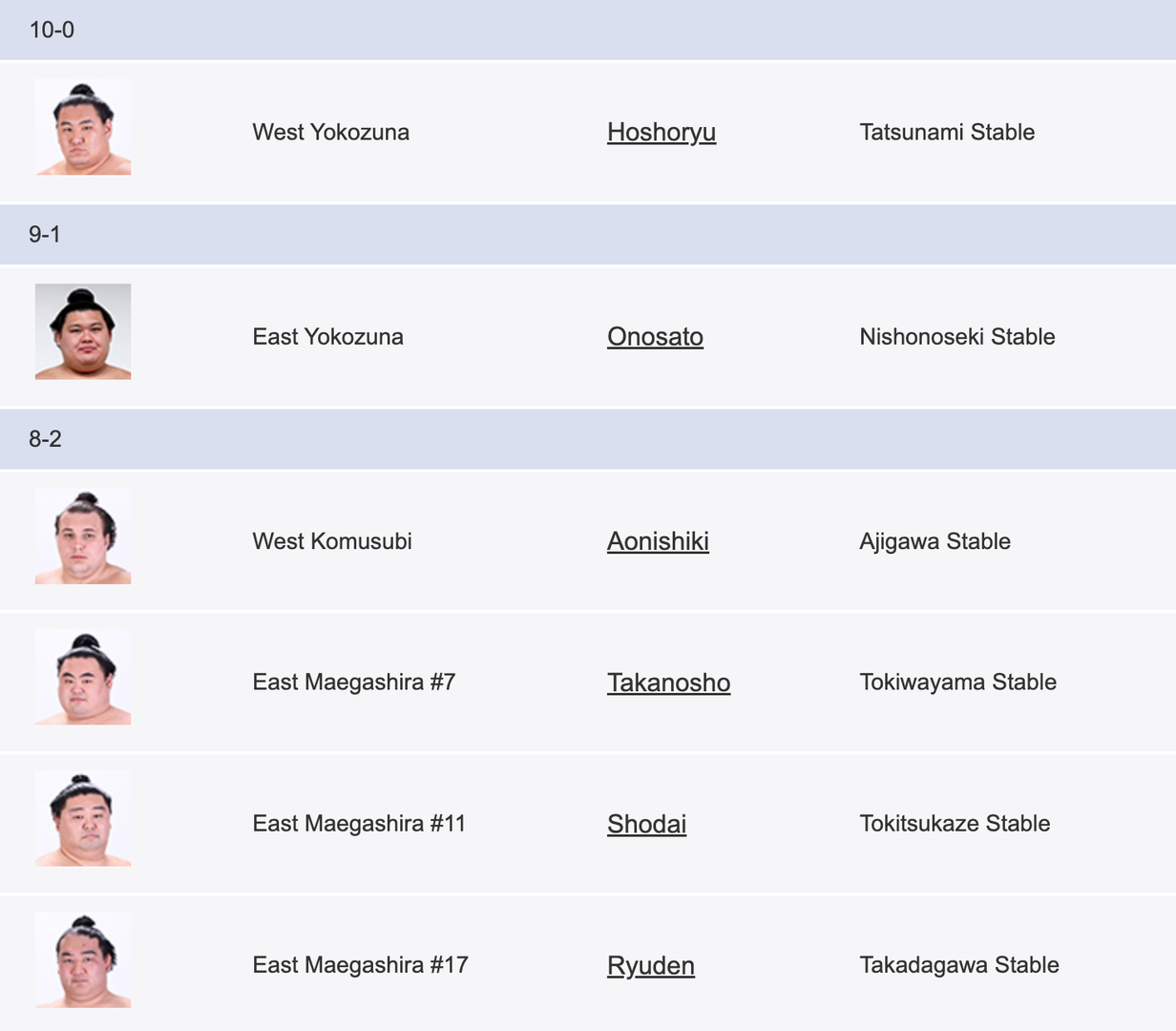 10 өдрийн дараах байдлаар Хошорюү С.Бямбасүрэн аварга бүх даваагаа авч башёг ганцаараа итгэл төгс тэргүүлж байна. Харин түүний ард есөн даваа, нэг унаатайгаар Оносато эрэмбэлэгдэж байна. Мөн түүнчлэн найман даваа, хоёр унаатай дөрвөн ч бөх аваргуудтай хамт башёг тэргүүлэгчдийн эгнээнд нэрлэгдэж байна.