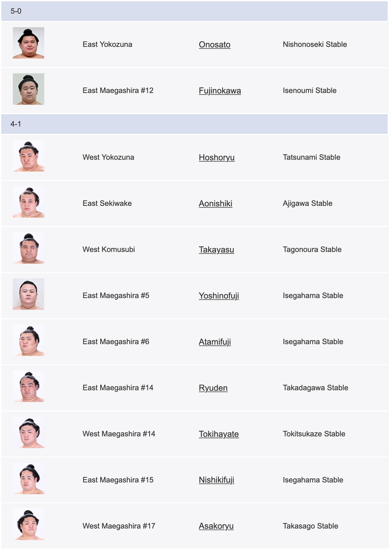 Таван өдрийн дараах байдлаар Оносато аварга болон Маэгаширагийн 12-т эрэмбэлэгдэж буй Фужинокава нар нэг ч уналгүйгээр тэргүүлж байгаа бол тэдний араас дөрвөн даваа, нэг унаатайгаар Хошорюү С.Бямбасүрэн аварга нарын есөн бөх нэхэж байна.