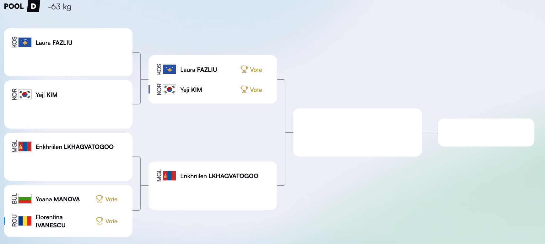 Дэлхийн аваргын хошой медальт МУГТ Л.Энхрийлэн D хэсэгт өрсөлдөх ба эхний тойрогт гоц мөргөж улмаар хоёрдугаар тойрогт Болгар болон Румыны жүдочдын хэн ялсантай хүч үзэх оноолттой байна.